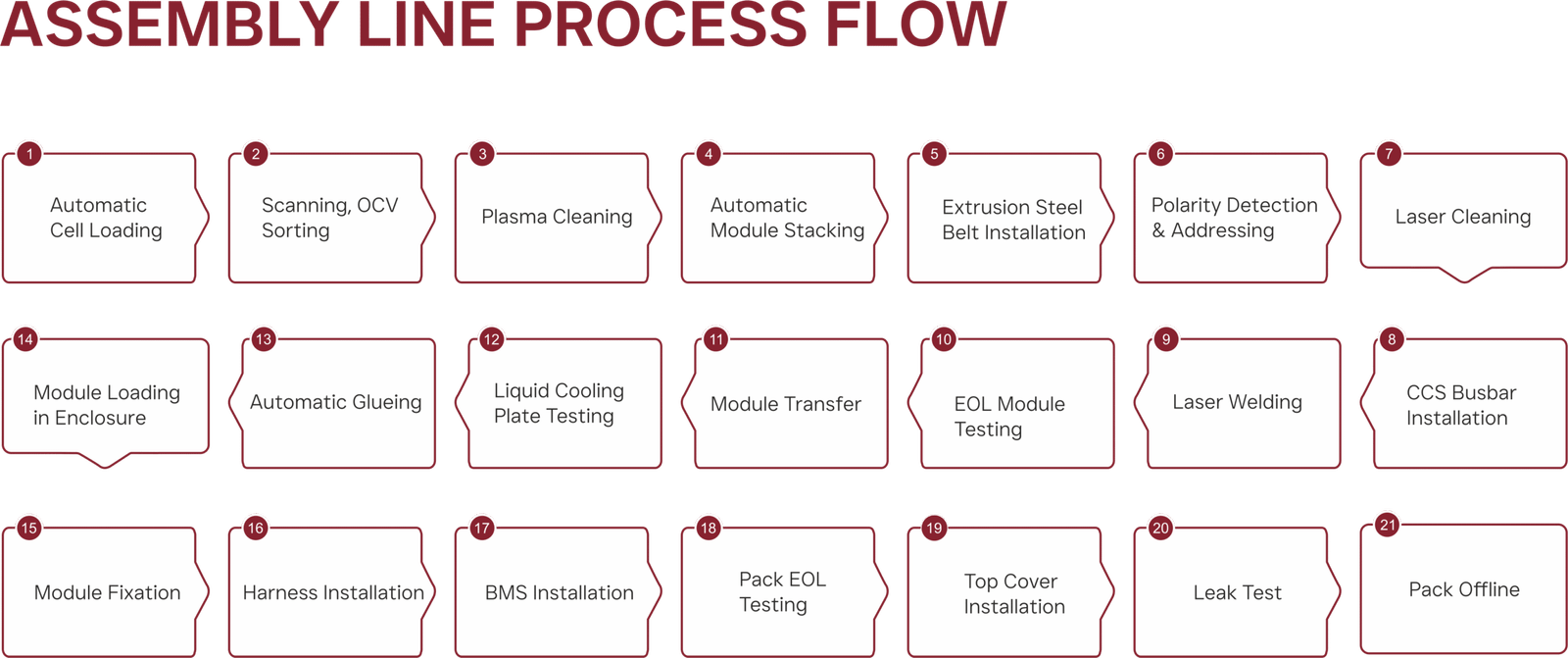 This line is designed for giga-scale lithium battery pack manufacturing, where speed and uniformity are paramount. With fully automated stations and robotic handling, it achieves exceptionally high pieces-per-minute (PPM) output while maintaining micron-level precision. Inline quality checks, laser welding accuracy, and process traceability ensure zero-defect reliability. Ideal for large OEMs and energy storage integrators demanding maximum throughput, global compliance, and 24/7 operational efficiency.