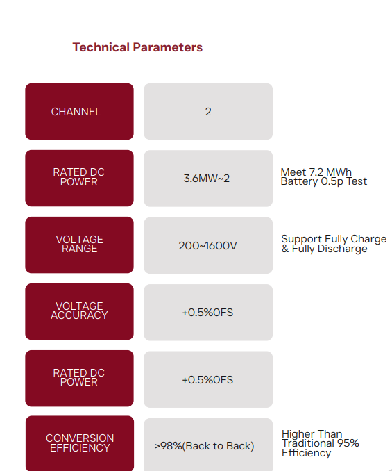 The system is designed for charge/discharge testing of energy storage battery clusters and DC cabins and is widely applied in ESS integration factories to evaluate battery performance before delivery. Through full-cycle testing, it provides deep insight into a BESS system’s performance, safety, and expected lifespan, making it a vital tool for assessing the reliability and cost efficiency of large-scale battery systems. The system collects live information on voltage, current, power, temperature, and capacity, and it can perform different types of tests, such as cycle life, C-rate (performance rate), capacity, and These functions help ensure battery safety, consistency, and long-term reliability across all operating conditions.
