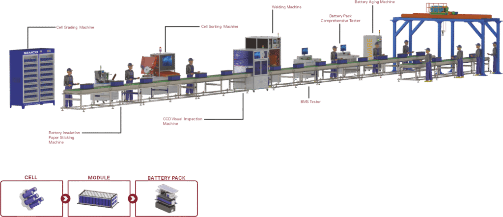 The Pack Line integrates final assembly, enclosure installation, and testing for scalable battery production.