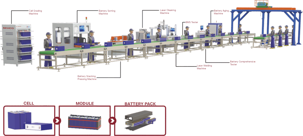 The Pack Line integrates final assembly, enclosure installation, and testing for scalable battery production.