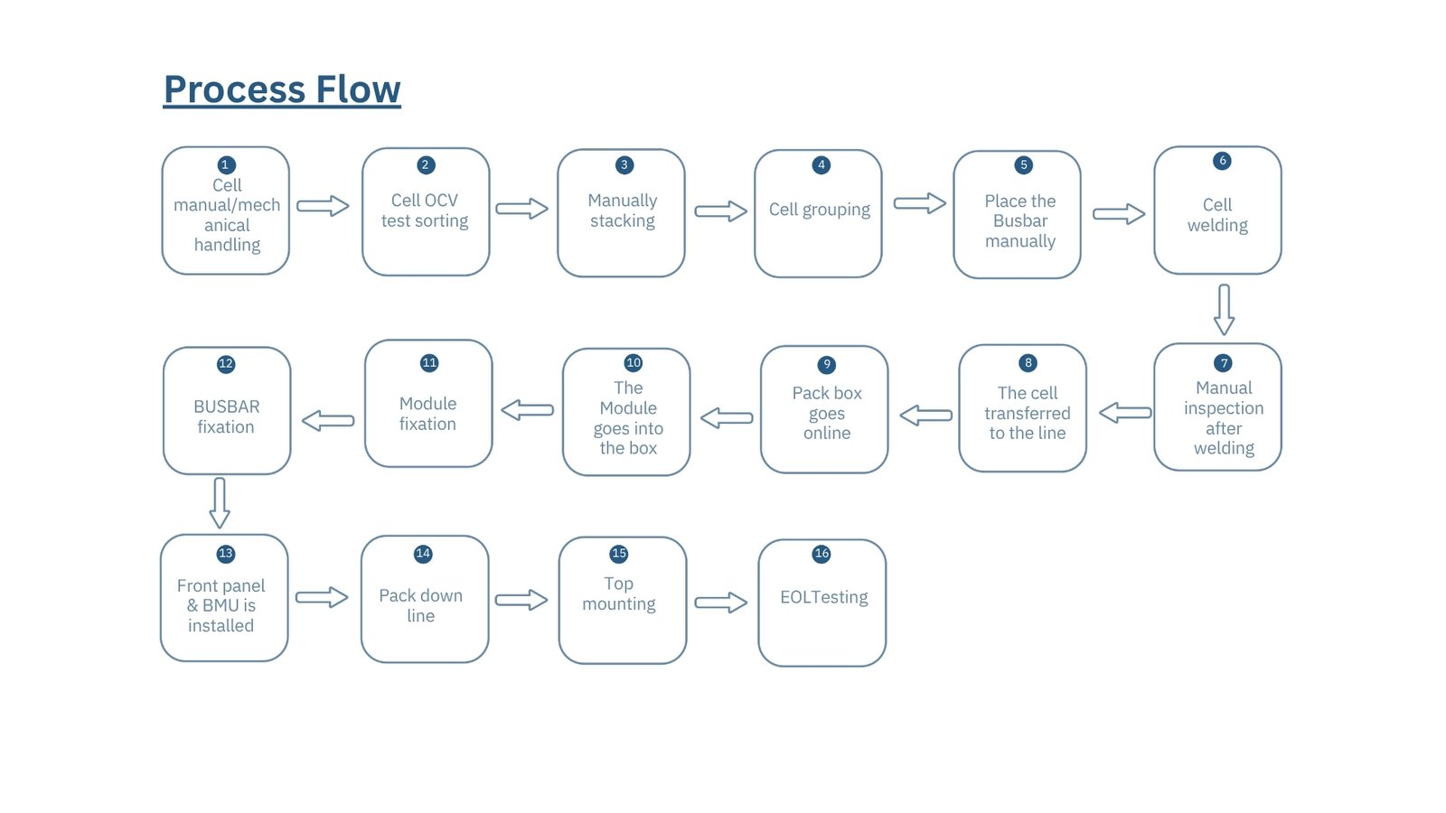 Semco’s 1-terminal semi-automated assembly line presents a smart and scalable entry point into automated lithium battery production. Featuring a high-precision in-line laser welding machine as its central automated station, the system is complemented by offline stations for cell preparation, compression, cleaning, and post-weld inspection—strategically arranged along a synchronized conveyor framework. This hybrid approach optimizes capital investment while ensuring process integrity and consistent output quality. Ideal for producers transitioning from manual setups to semi-automation, the solution offers modular expandability, minimal footprint, and seamless integration into existing production environments.