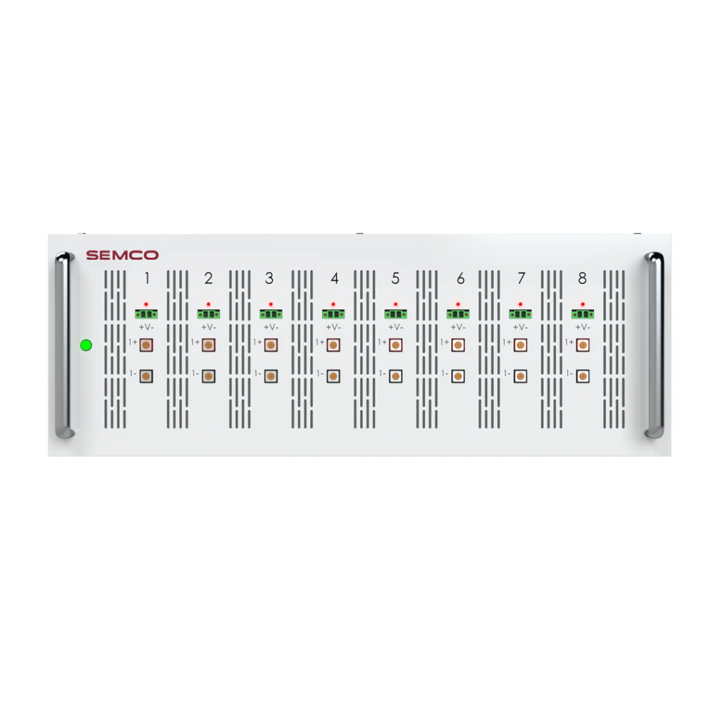 Semco SI BCDS 23V 50A 8CH , a high-precision Storage Battery Charge Discharge Tester designed for efficient testing and performance evaluation of battery cells. This advanced system supports 8 channels, allowing simultaneous testing of multiple batteries with high accuracy.